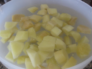 - Poner a calentar agua en un cazo,en el momento que rompa a hervir añadir el jengibre escurrido y llevarlo a ebullicion durante 4 minutos.Sacar, escurrir y refrescar con agua fría.