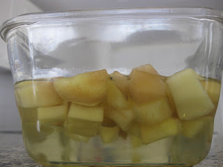 - Poner el jengibre en un bol de cristal y añadirle el almíbar que acabamos de hacer. Lo dejamos reposar durante 12 horas.