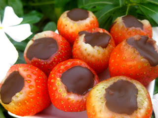 - Rellenar las fresas y meter en el frigo para que endurezca el chocolate . El chocolate queda duro por eso escogí fresas pequeñas,para poner menos cantidad. Si quereis algo más blandito rellenarlas de Nutella y al frigo hasta el momento de servirlas