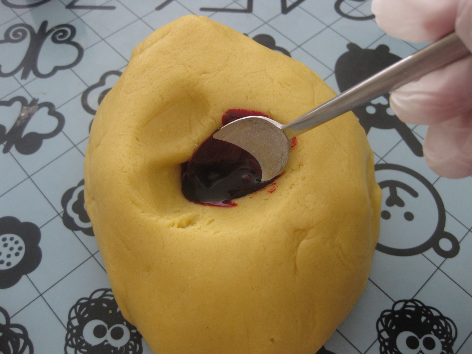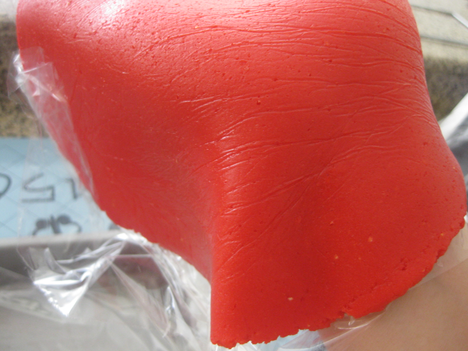 - Dividir la masa en 2 y añadir los colorantes.Yo necesité media cucharita de rojo y 1/4 cucharita de amarillo,mejor ponerlo a poquitos.Amasar bien hasta que quede el color uniforme