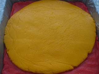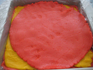 - Estirar la masa amarilla de un grosor de 1 cm y colocarla encima de la roja