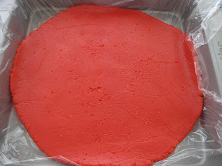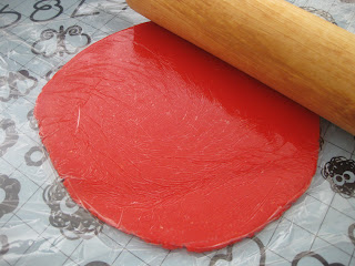 - Dividir la masa roja en dos , poner entre dos film y estirar con el rodillo de un anchura de 0,5 cm .Colocar en el molde cubriendo el fondo,ayudaros con las manos para las esquinas